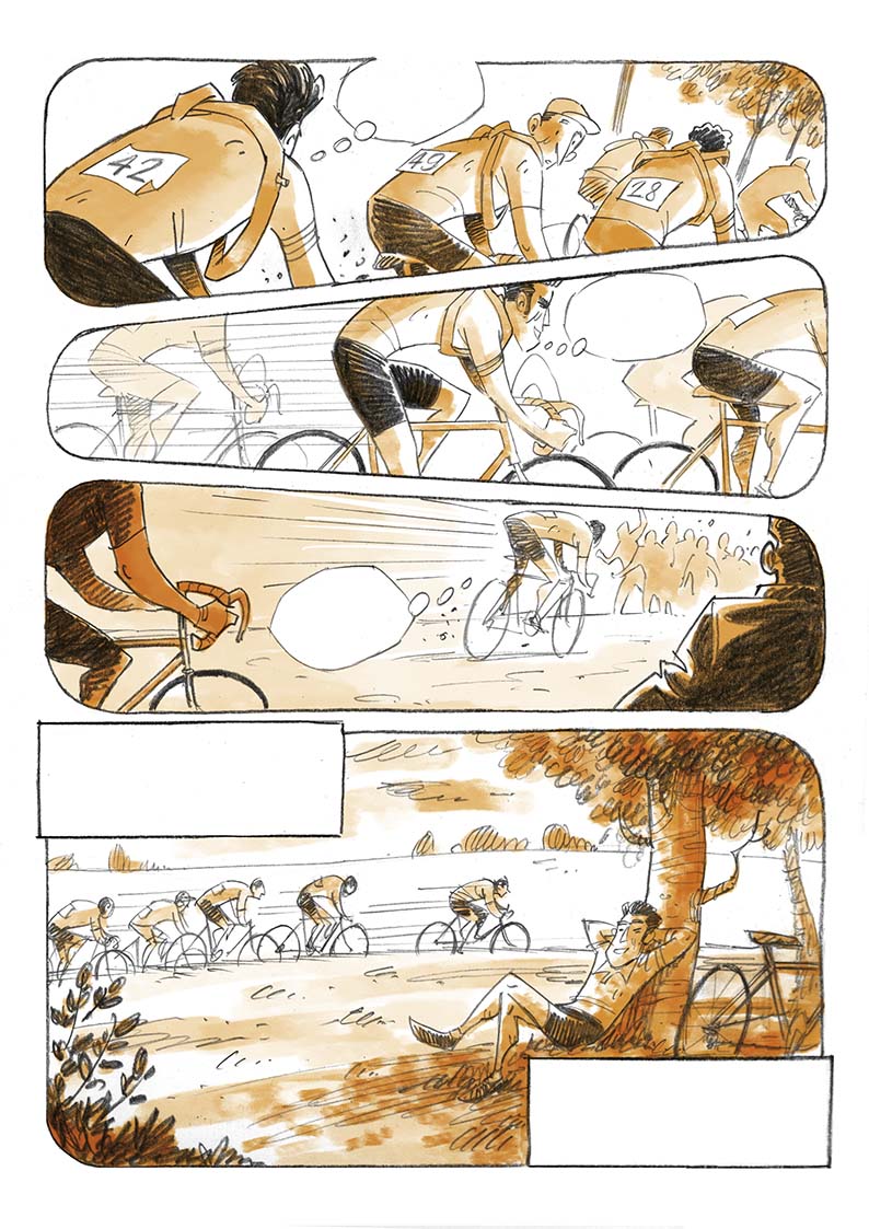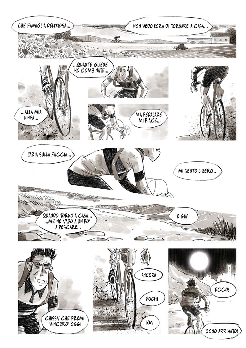 «Quando mi hanno proposto di realizzare un fumetto su di lui ho accettato subito di buon grado – racconta Lauciello, classe 1971 – per me era un’occasione preziosa per rimettermi alla prova con il fumetto, mio primo e grande amore, e cimentarmi con un tema così particolare. Ho dovuto documentarmi sia per l’aspetto tecnico che sul piano storico, reperire fotografie, filmati d’epoca e… imparare a disegnare biciclette: tutt’altro che semplice!»