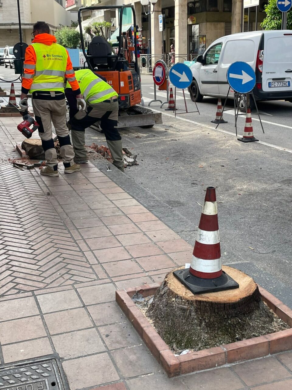 Gli esemplari, dopo un attento monitoraggio, avevano presentato rischi di cedimento in considerazione dell’altezza raggiunta e per le oscillazioni provocate dal vento che li facevano sbattere contro i terrazzi del vicino edificio. E’ stato quindi necessario intervenire a tutela della sicurezza e dell’incolumità pubblica. Prima della piantumazione delle nuove essenze è stato eseguito il lavoro di “cippatura” (riduzione in scaglie) delle palme con un macchinario specifico. Terminate le operazioni gli esemplari abbattuti sono sostituiti con alberi adatti al luogo.