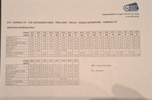 Dal 3 febbraio al 14 giugno 2026 sono in vigore i nuovi orari provvisori della navetta 973, servizio che collega Camogli e Recco.
