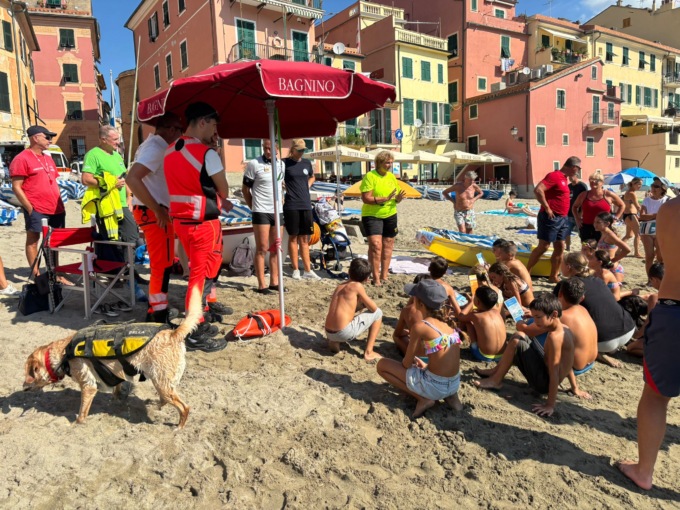 Prima delle prove, una volontaria dell’Unità Cinofila di Salvataggio di Nervi ha introdotto l’attività coinvolgendo i bambini presenti in spiaggia con un momento educativo e partecipativo.
