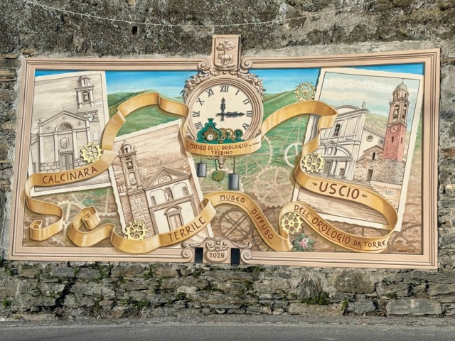 Il murales si trova lungo la SP 333 in località Giro del Grigio, a 20 metri dalla piazza di Uscio e rappresenta la storia degli orologi da torre, con la raffigurazione delle tre chiese principali e delle due realtà museali di Uscio, il Museo dell’orologio Roberto Trebino e il Museo diffuso dell’orologio da torre di Uscio, attività tipica del paese da oltre 250 anni. Il murales opera del decoratore Ennio Lagomarsino propone la narrazione degli orologi da torre nel contesto delle tre chiese principali a Uscio e Calcinara e Terrile.