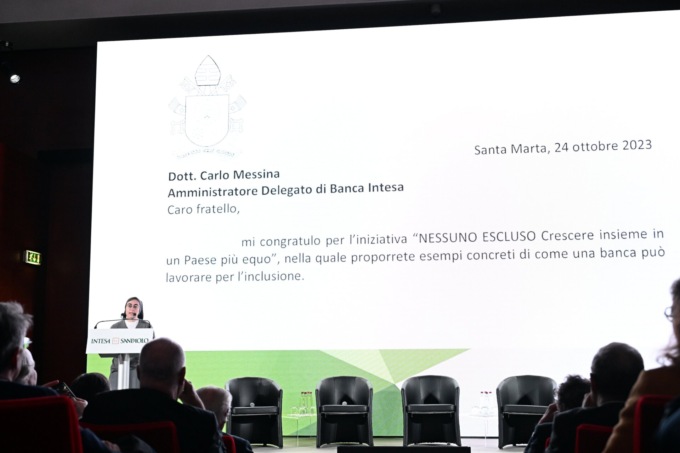 Suor Alessandra Smerilli, segretario del Dicastero per il Servizio dello Sviluppo Umano Integrale, ha portato i saluti di Papa Francesco, leggendo una lettera indirizzata direttamente a Carlo Messina: il Santo Padre, congratulandosi per l’iniziativa della banca, auspica “un modello di sviluppo in grado di generare soluzioni nuove, più inclusive e sostenibili a sostegno dell’economia reale, aiutando individui e comunità a realizzare le loro aspirazioni più profonde e il bene comune universale”. Smerilli ha quindi sottolineato come il settore privato abbia una responsabilità enorme di fronte agli stalli della politica e della burocrazia.