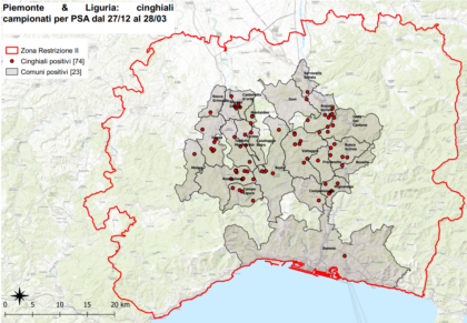Nella mappa i punti colorati mostrano il luogo di ritrovamento degli animali positivi per peste suina africana.