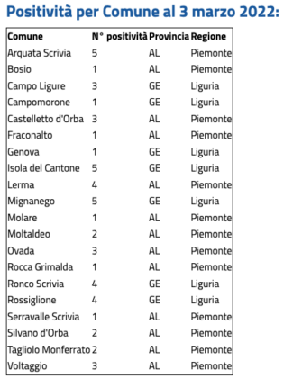 I positivi sono 52, uno in più rispetto all’aggiornamento precedente: 29 per ritrovamenti in Piemonte, 23 per ritrovamenti in Liguria.