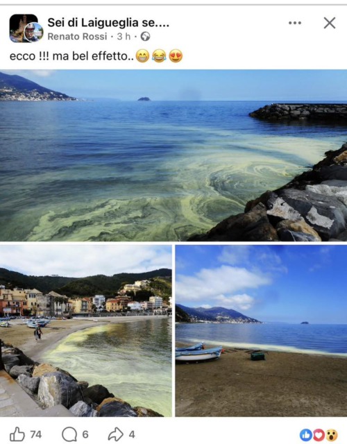 Un curioso malinteso ha alimentato un dibattito social nelle scorse ore tra gli utenti facebook di Zoagli e non solo. Proprio da Zoagli una signora lombarda, Daniela, milanese originaria sembra di Belgioioso (Pavia) non è chiaro se in vacanza nella riviera di Levante o proprietaria di una casa nella zona, ha postato foto e video con tanto di denuncia: “Questo orrore non lo avevo mai visto – scrive Daniela –  il mare ieri e oggi era magico, e in mezz’ora …..”.