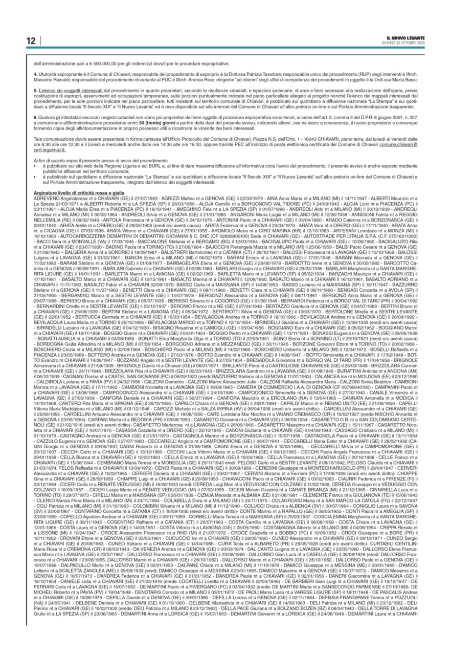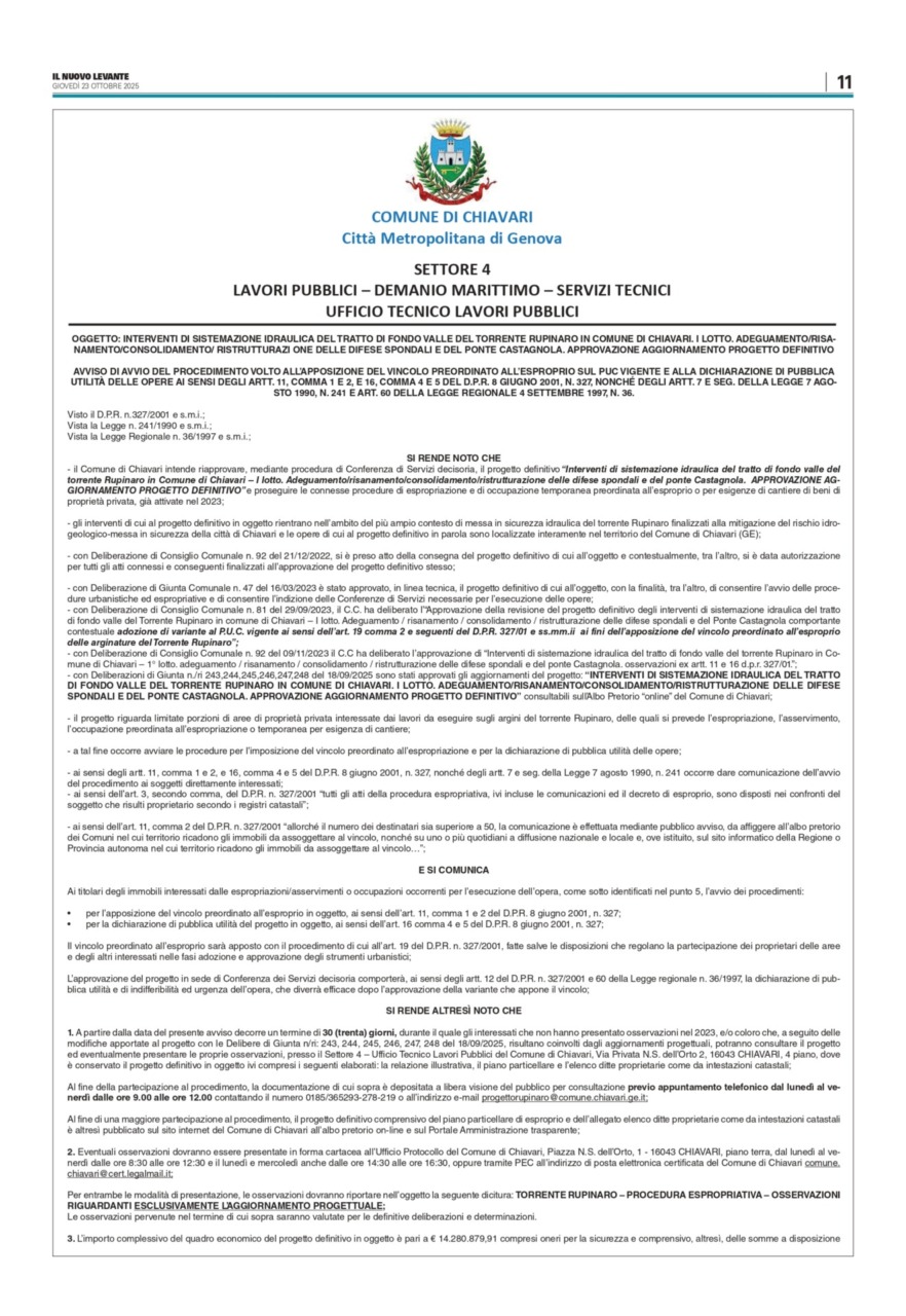 Prosegue l’iter per la messa in sicurezza del torrente Rupinaro. A partire da domani, mercoledì 22 ottobre, verrà pubblicato l’avviso di avvio del procedimento relativo agli espropri necessari alla realizzazione degli interventi di sistemazione idraulica del tratto di fondo valle del torrente, che prevedono l’adeguamento, il risanamento e il consolidamento delle difese spondali e del ponte Castagnola.