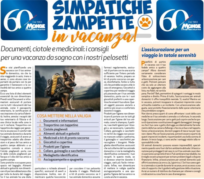 Nelle famiglie italiane vivono quasi 65 milioni di animali da compagnia, di cui quasi 9 milioni di cani e 10 milioni di gatti. E l’estate scorsa sono stati circa 8,5 milioni gli italiani che hanno scelto di partire in vacanza con i propri amici, grazie a una accresciuta cultura dell’ospitalità “pet friendly” lungo tutta la Penisola. Certamente anche quest’anno molti di voi trascorreranno le vacanze insieme a loro: ecco quindi la nostra nuova iniziativa, Simpatiche Zampette in vacanza, grazie al sostegno di un partner d’eccezione come Monge, la più grande realtà industriale italiana nel settore degli alimenti per cani e gatti, con sede a Monasterolo di Savigliano in provincia di Cuneo, che quest’anno festeggia 60 anni di storia e successi nel mondo del pet food.