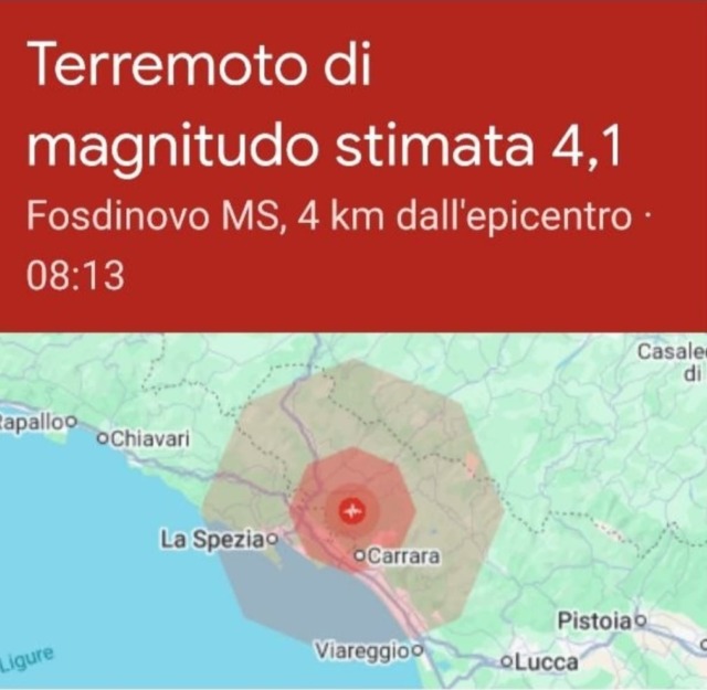 Intorno alle 8:13 di questa mattina, mercoledì 25 marzo, si è verificata una scossa con magnitudo tra di 3,9 e 4,4 nelle zone di Massa-Carrara, a 4km dall’epicentro.