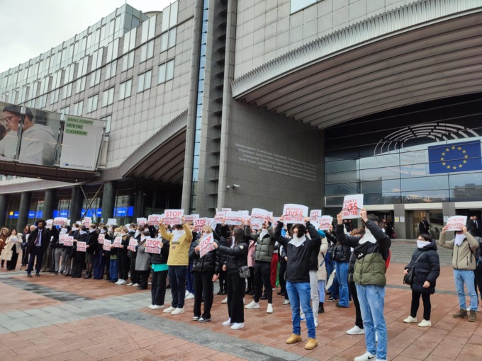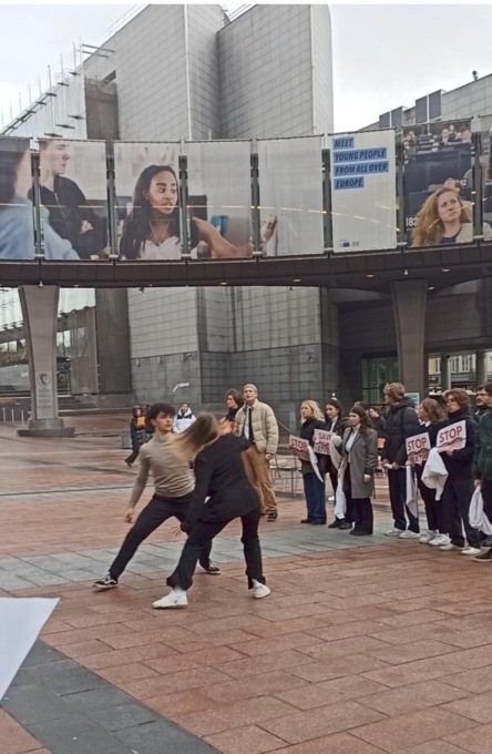Giovedì 9 marzo, in Place du Luxembourg, davanti alla sede del Parlamento Europeo ha preso vita il flash mob organizzato dalle studentesse e dagli studenti del Liceo Coreutico “G. Marconi” di Pesaro: davanti a loro, che guidavano l’azione cantando e danzando, più di trecento persone hanno seguito i loro suggerimenti, esprimendo il cordoglio per le vittime dei terribili naufragi e chiedendo a gran voce “Basta morti alle frontiere”.