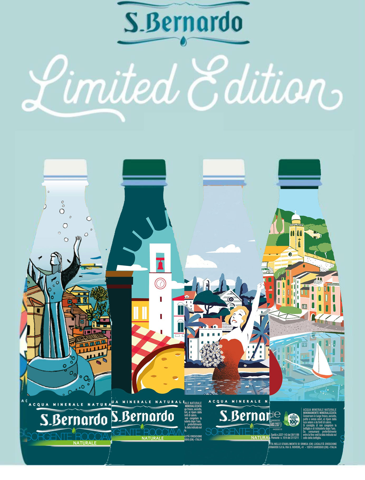 Acqua San Bernardo mezzolitro Pet Premium Limited Edition racconta attraverso coloratissimi disegni, le bellezze di Recco, Chiavari, Portofino, Santa Margherita Ligure, Rapallo, Camogli e Sestri Levante: dalla gastronomia locale di Recco alla pittoresca piazza di Chiavari, dai colorati scorci di Portofino al Castello di Rapallo e, ancora, il lungomare di Santa Margherita, passando per le suggestioni di Camogli e di Sestri Levante, con il suo celebre Cristo degli Abissi.