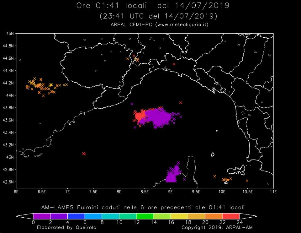 Arpal, l’Agenzia regionale protezione ambiente ligure, riferisce che “Al momento i fenomeni temporaleschi, come da immagine relativa alle fulminazioni, sono rimasti confinati in mare. Sulla Liguria si sono, invece, avute deboli piogge con cumulata massima dalla mezzanotte di 13.6 millimetri a Stella Santa Giustina, nel savonese. La fase instabile è, comunque, destinata a proseguire e si attende anche un rinforzo dei venti”.