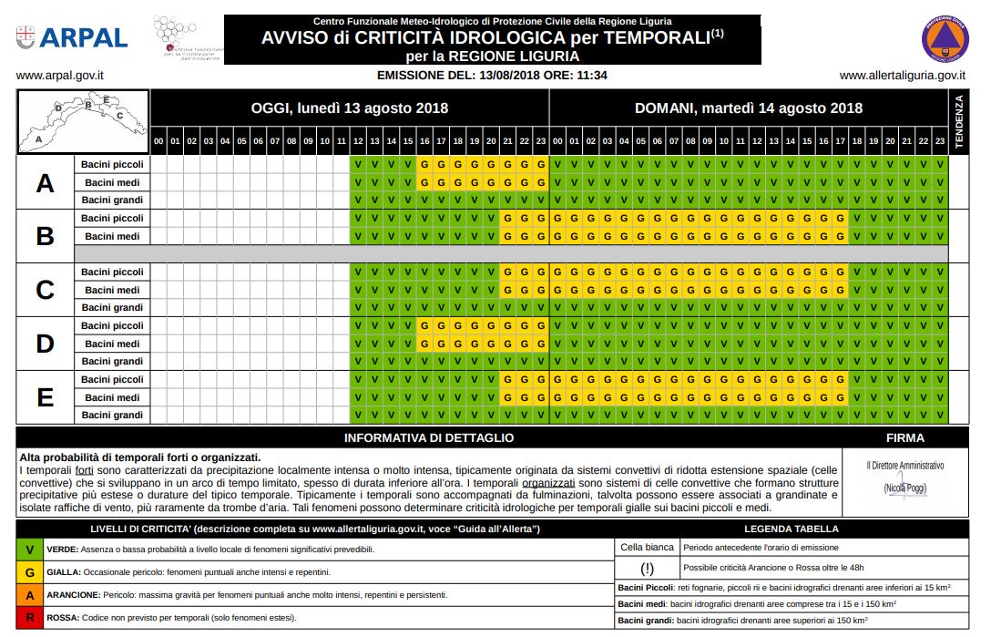 La Protezione Civile Regionale ha diffuso l’allerta meteo gialla, per i bacini piccoli e medi, emanata da Arpal con i seguenti orari: