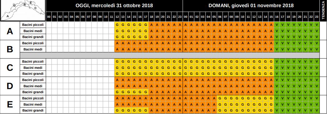 ZONA A (TUTTI I BACINI): GIALLA fino alle 18 di OGGI, MERCOLEDI’ 31 OTTOBRE, POI ARANCIONE fino alle 16 di DOMANI, GIOVEDI’ 1 NOVEMBRE