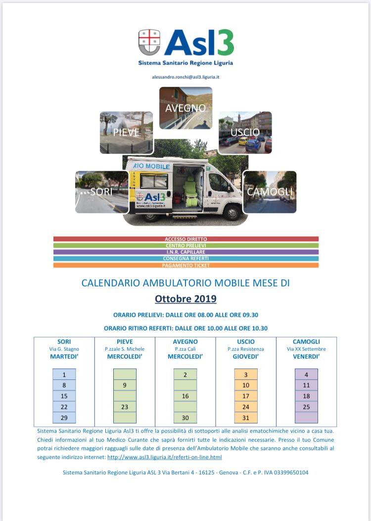 Il Comune di Pieve Ligure rende noto che nel mese di ottobre il servizio dell’ambulatorio mobile – che consente ai residenti del distretto sociosanitario 13 Levante, Uscio, Avegno, Sori, Pieve Ligure e Camogli, di effettuare esami del sangue senza prenotazione, ritirare referti e pagare il ticket – sarà presente in piazzale San Michele nelle giornate di mercoledì 9 e mercoledì 23.