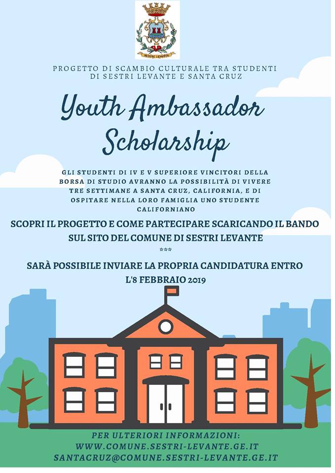 È on line sul sito del Comune di Sestri Levante il bando per la “Youth Ambassador Scholarship” una borsa di studio che darà l’opportunità a due ragazzi residenti a Sestri Levante e iscritti alla quarta e alla quinta superiore di qualsiasi istituto del territorio, di vivere nel corso dell’estate tre settimane a Santa Cruz, ospitati dalle famiglie dei ragazzi californiani che avranno vinto l’omologo bando e che avranno a loro volta la possibilità di trascorrere tre settimane a Sestri Levante.
