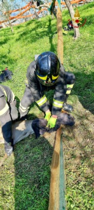 Capriolo incastrato con i palchi nella rete liberato dai Vigili del fuoco