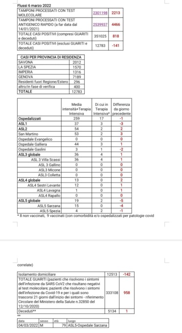 Sono 818 i nuovi positivi registrati nelle ultime 24 ore in Liguria a fronte di 6.679 tamponi effettuati, di cui 2.213 molecolari e 4466 test rapidi antigenici.