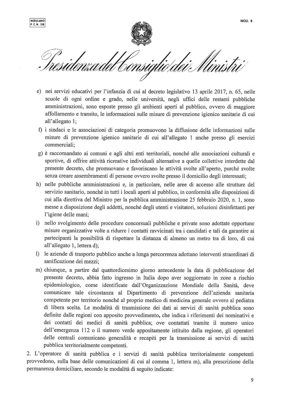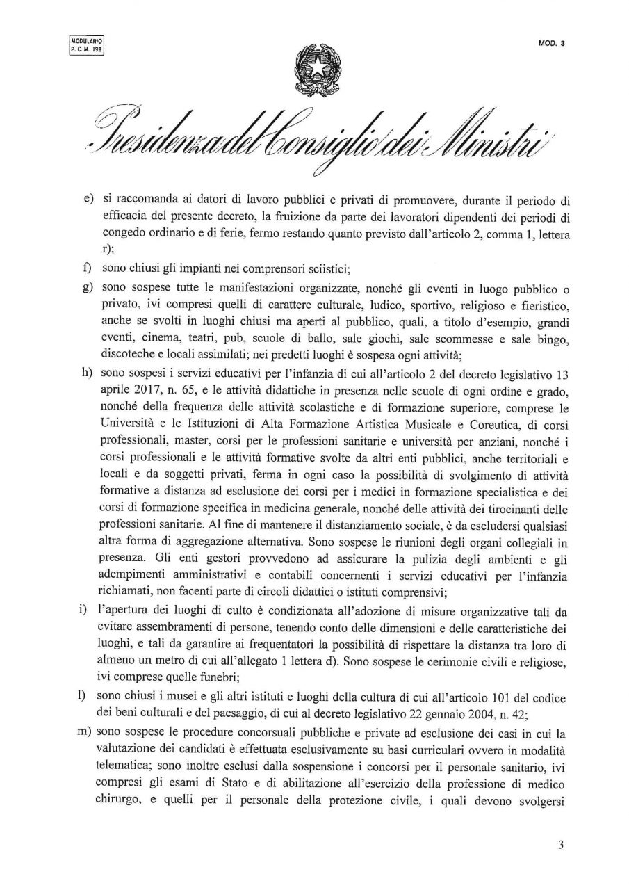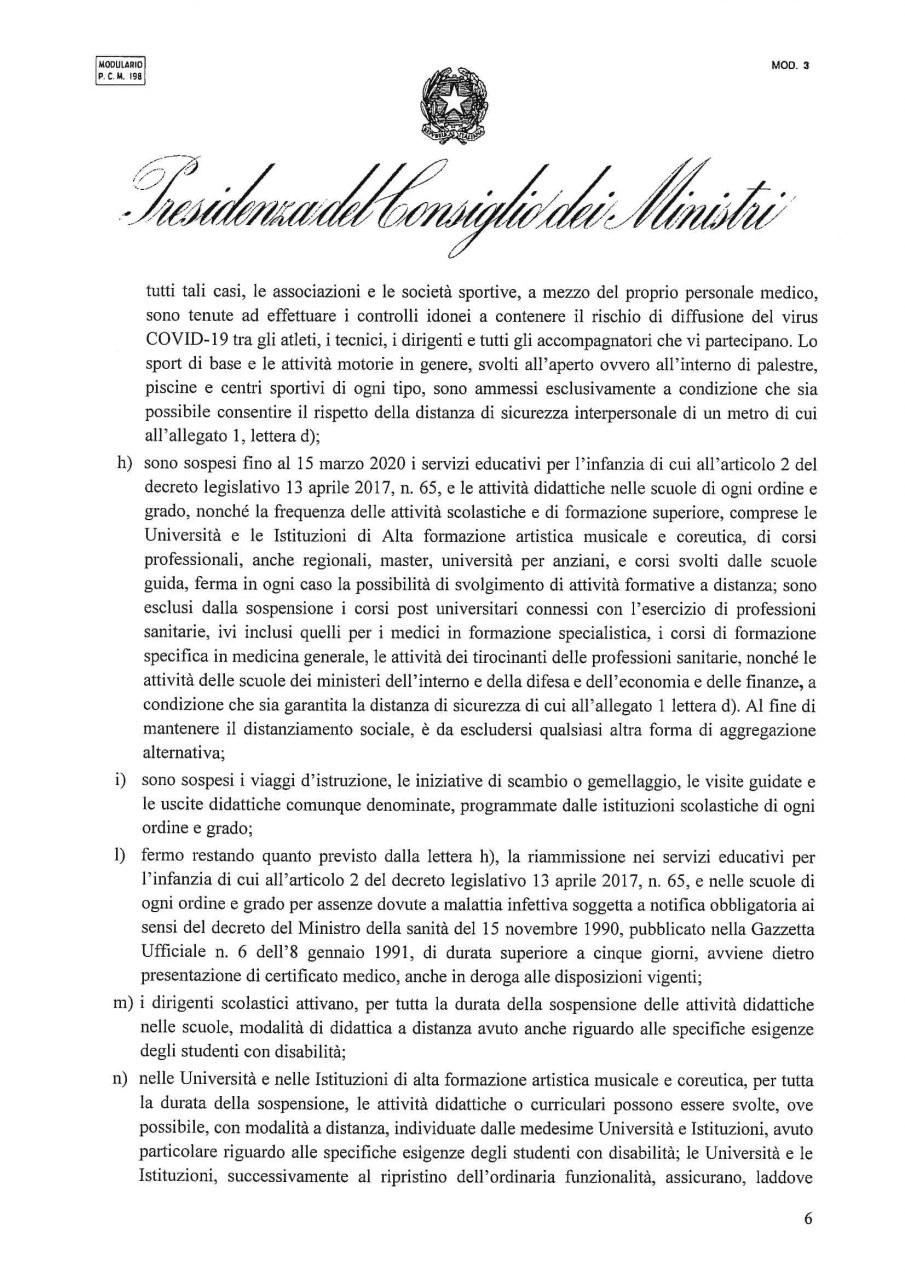 Non c’è divieto assoluto di movimento ma necessità di motivarlo, quindi una ridotta mobilità. - Chiusura degli Istituti di ogni ordine e grado e degli Atenei