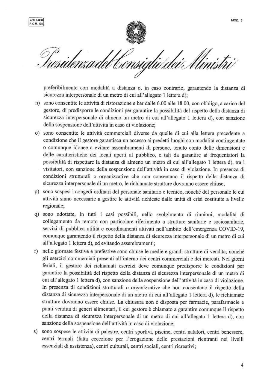 - Consentite le attività commerciali diverse da quelle di cui alla lettera precedente a condizione che il gestore garantisca un accesso ai predetti luoghi con modalità contingentate e che sia garantita la distanza di 1 metro tra le persone. NB PER LE ATTIVITÀ CHE NON RISPETTERANNO I SUDDETTI OBBLIGHI È PREVISTA LA CHIUSURA.