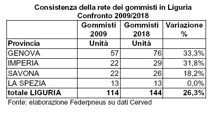 Nel 2018 in Liguria la rete dei gommisti ha toccato quota 144 aziende. Rispetto al 2009, quando la rete dei gommisti era costituita da 114 attività, vi è stato un aumento del 26,3%. La provincia della Liguria che ha fatto registrare la crescita maggiore del numero dei gommisti è Genova (+33,3%), seguita da Imperia (+31,1%) e Savona (+18,2%). A La Spezia il dato è rimasto invariato. Questi dati, di fonte Cerved, emergono da un’elaborazione di Federpneus (Associazione Nazionale Rivenditori Specialisti di Pneumatici).