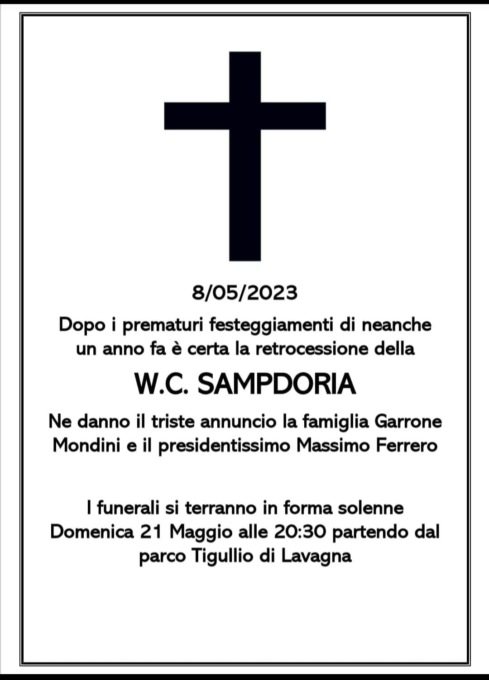 “Dopo i prematuri festeggiamenti di neanche un anno fa, è certa la retrocessione della W. C. Sampdoria. Ne danno il triste annuncio la famiglia Garrone Mondini e il presidentissimo Massimo Ferrero. I funerali si terranno in forma solenne domenica 21 maggio alle 20.30 partendo dal parco Tigullio di Lavagna“:
