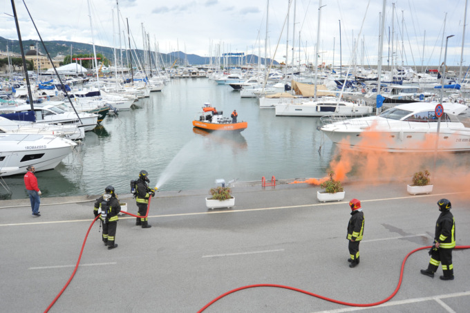 Alle 9.50, la prova antincendio dei Vigili del Fuoco in collaborazione con Guardia Costiera e Marina Chiavari e i soccorsi ha mostrato cosa succede in caso di emergenza.