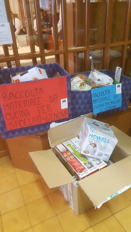 Stamattina lunedì 21 gennaio è stata consegnata la seconda partita di materiale raccolto per gli sfollati di Genova alla Scuola Alberghiera “Città di Lavagna” in occasione del banchetto del 22 dicembre la quale provvederà direttamente alla consegna. Con le offerte sono stati piccoli elettrodomestici. “Ringraziamo la città di Lavagna che, come sempre, ha dimostrato un cuore generoso!”, dicono.