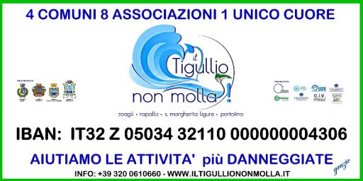 “Quattro Comuni, otto Associazioni, un unico cuore, un unico conto, perchè “il Tigullio non Molla” e vogliamo aiutare le attività più danneggiate dalla mareggiata del 29/30 ottobre. Grazie. Il poco di ciascuno renderà grande la raccolta”