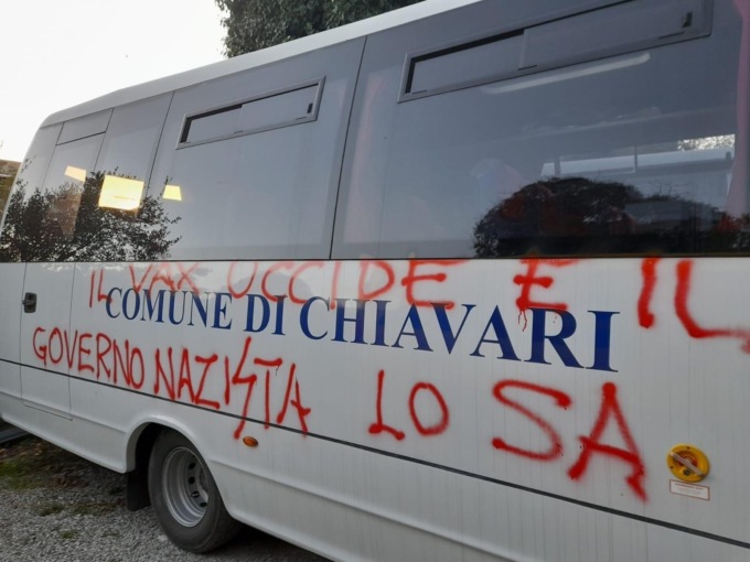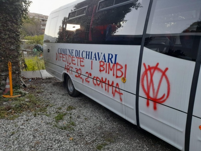 Sono stati trovati questa mattina 5 pulmini utilizzati per il servizio scolastico imbrattati con scritte “no vax” all’interno del parcheggio attiguo al cimitero.
