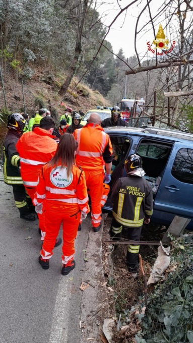 Nel pomeriggio di oggi i Vigili del fuoco di Rapallo sono intervenuti in via Carbonara, a Recco, per un incidente stradale. Il conducente della vettura ha perso il controllo urtando contro degli ostacoli ed ha finito la corsa rimanendo in bilico sulla sottostante scarpata. I Vigili del fuoco hanno dapprima messo in sicurezza il mezzo ed in seguito hanno estratto gli occupanti consegnandoli alle cure del 118.