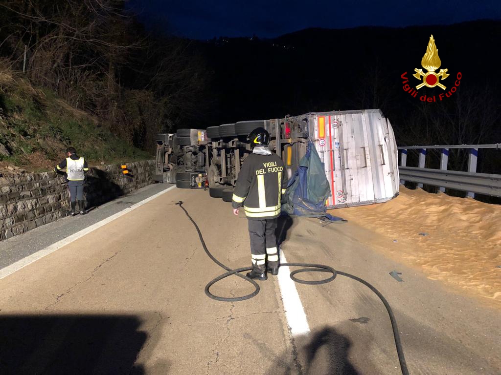 I vigili del fuoco di Busalla stanno intervenendo sulla A7, in direzione Genova, per un incidente stradale che ha coinvolto un autoarticolato trasportante mangime per animali. Per cause in via di accertamento, questo si è ribaltato su un fianco perdendo il carico e occludendo entrambe le carreggiate. L’autista è riuscito ad uscire autonomamente dal camion ed è alle cure del 118. L’incidente è successo poco dopo la galleria Campora in direzione SUD al KM 115 e 200. Il traffico è bloccato.