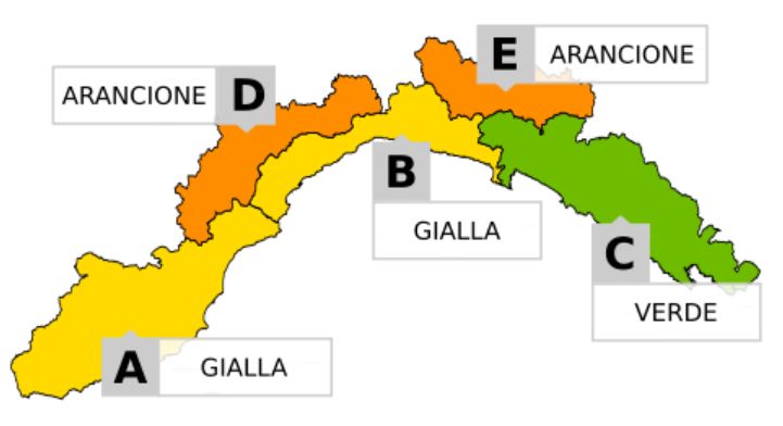 ZONE D (Valle Stura ed entroterra savonese fino alla Val Bormida) ed E (Valle Scrivia, Val d’Aveto e Val Trebbia): ALLERTA GIALLA fino alle 15 di OGGI LUNEDI’ 5 FEBBRAIO. Successivamente ARANCIONE fino alle 9 di DOMANI MARTEDI’ 6 FEBBRAIO e quindi nuovamente GIALLA fino alle 23.59.