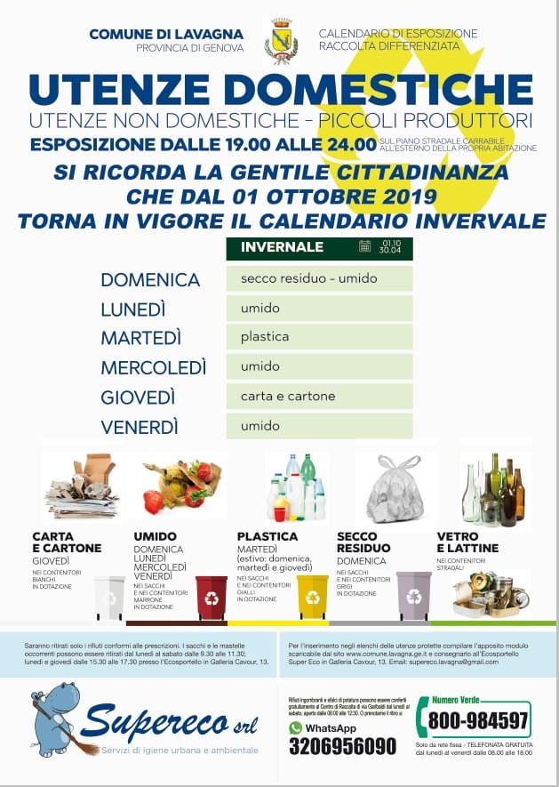 Dal 1° ottobre 2o19 scatta l’orario invernale per la raccolta differenziata a Lavagna: ecco i giorni da seguire per il conferimento di carta e cartone, plastica, umido e secco residuo. La spazzatura può essere depositata dalle 19 a mezzanotte.