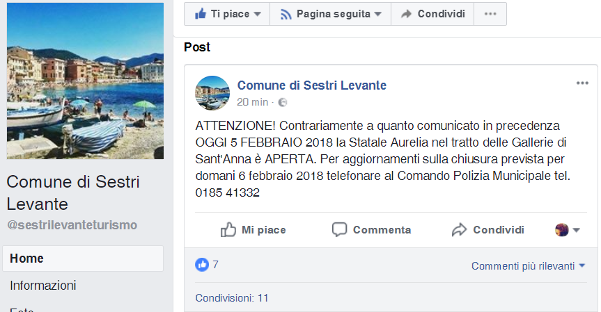 A dare la comunicazione della non chiusura delle gallerie, è stato lo stesso Comune di Sestri Levante su Facebook lunedì 5 febbraio alle 11.17.