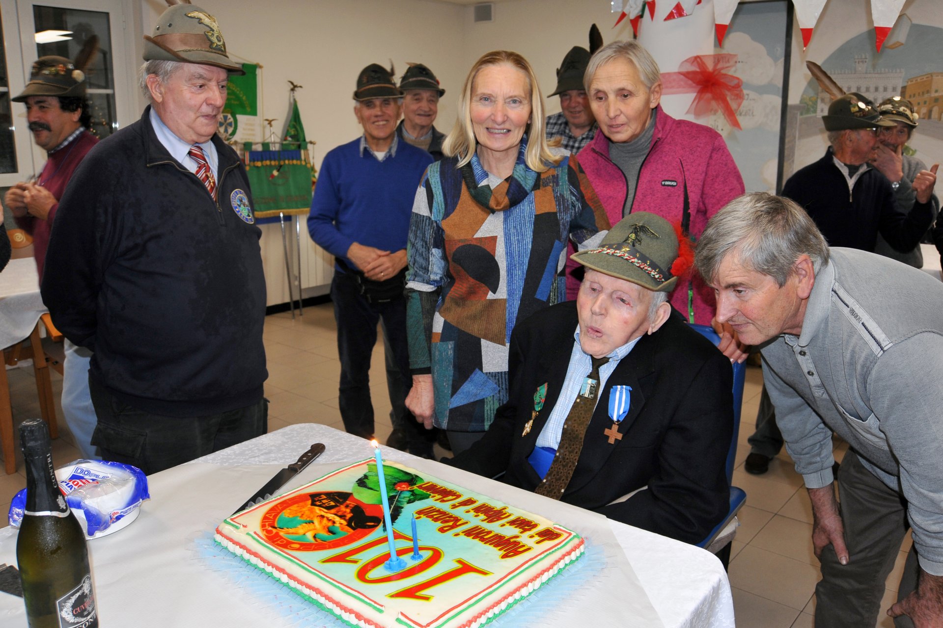 Marco Callegari, trombettiere del gruppo di Chiavari, in onore del reduce ha suonato l’inno degli alpini, la leggenda del Piave ed il struggente “Silenzio”. Grande la commozione generale e molto applaudito Renzin allo spegnimento delle candeline e al taglio della monumentale torta, bordata di tricolore, decorata con lo stemma alpino di Chiavari ed un grande cappello alpino. Al taglio il reduce centenario è stato coadiuvato da Ornella Mattarini, presidente della Regione Liguria dell’Unirr, Associazione nazionale italiani reduci di Russia.