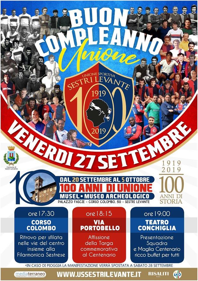 L’Unione Sportiva Sestri Levante 1919 festeggia un secolo di storia. Venerdì 27 settembre, lo stesso gioco in cui 100 anni fa venne fondato il club rossoblu, si svolgerà la grande festa per il Centenario corsaro.