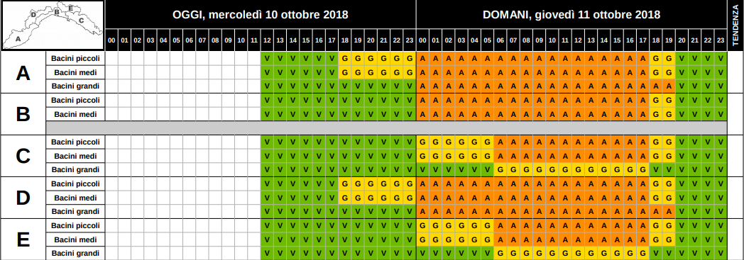 ZONA C (BACINI MEDI E PICCOLI): gialla dalle 00.00 alle 6.00 di domani giovedì 11, poi arancione fino alle 18, quindi gialla fino alle 20.