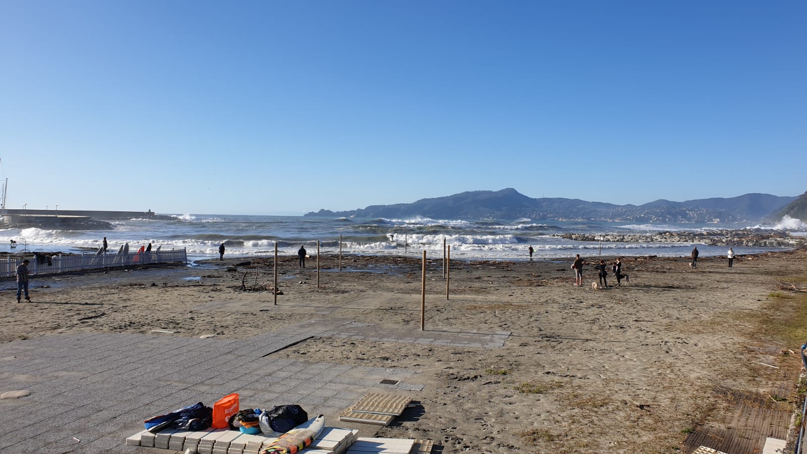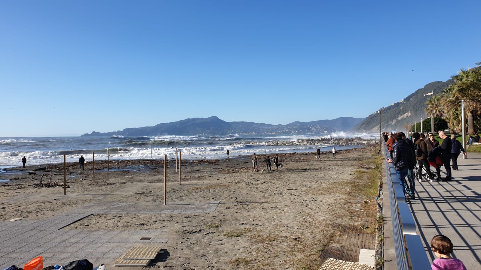 Bella mareggiata in corso a Chiavari. Dalla spiaggetta del porto una ventina di surfisti stanno prendendo le onde, mentre in corso Valparaiso all’altezza del bar oasi chiuso il marciapiede pedonale per sassi lanciati dal mare.
