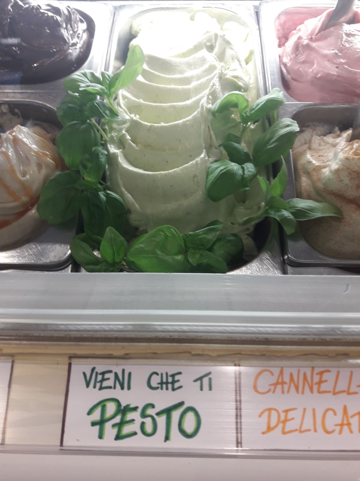 Un’idea senza dubbio originale. E noi eravamo presenti durante alcuni assaggi. E se in tanti clienti, al solo pensiero del gelato al pesto hanno arricciato il naso, in molti come prima reazione hanno esclamato piacevolmente sorpresi: “Sì, sà proprio di pesto”…