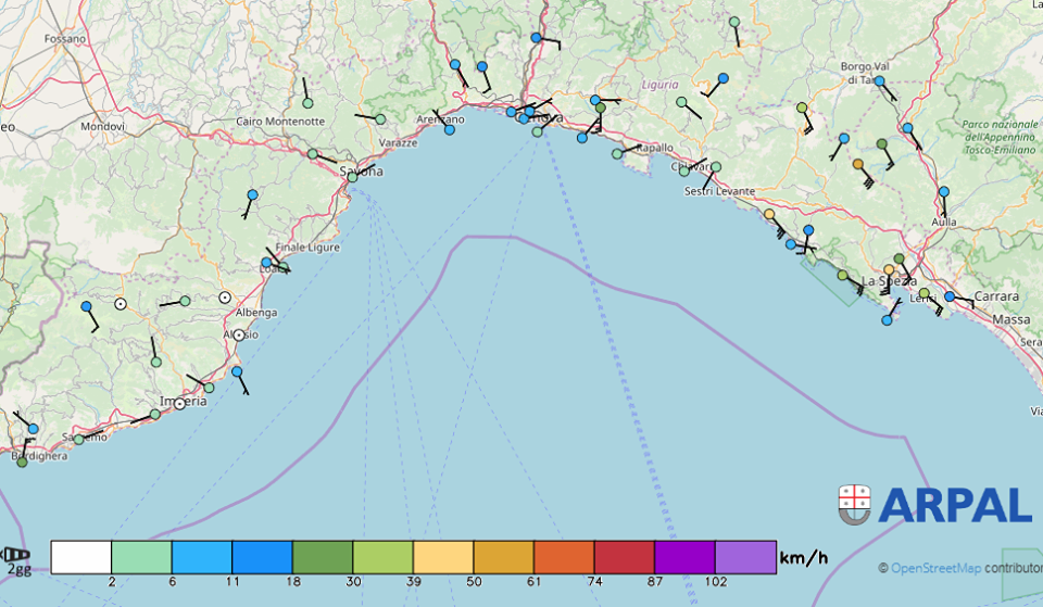 “La struttura temporalesca che ha attraversato velocemente la nostra regione – riferisce Arpal – sta riservando le ultime intense precipitazioni nell’entroterra genovese di levante: a Barbagelata nell’ultima ora sono caduti 52.6 mm”.