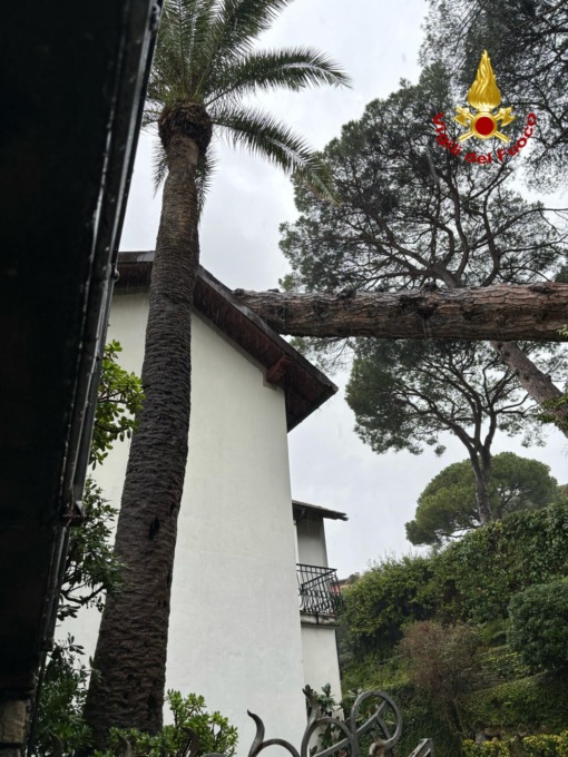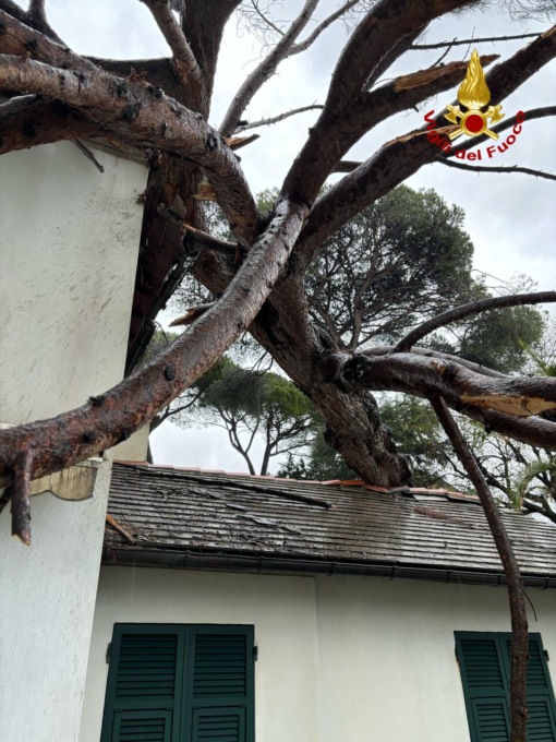 A causa delle forti piogge degli ultimi giorni, un grande pino marittimo, alto circa 25 metri, si è abbattuto nel pomeriggiosu una villa a tre piani, al momento non abitata, causando danni all’immobile e finendo con la fronda anche sulla strada tra Rapallo e Santa Margherita Ligure, all’altezza di San Michele di Pagana.