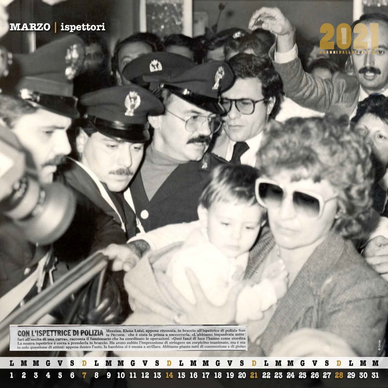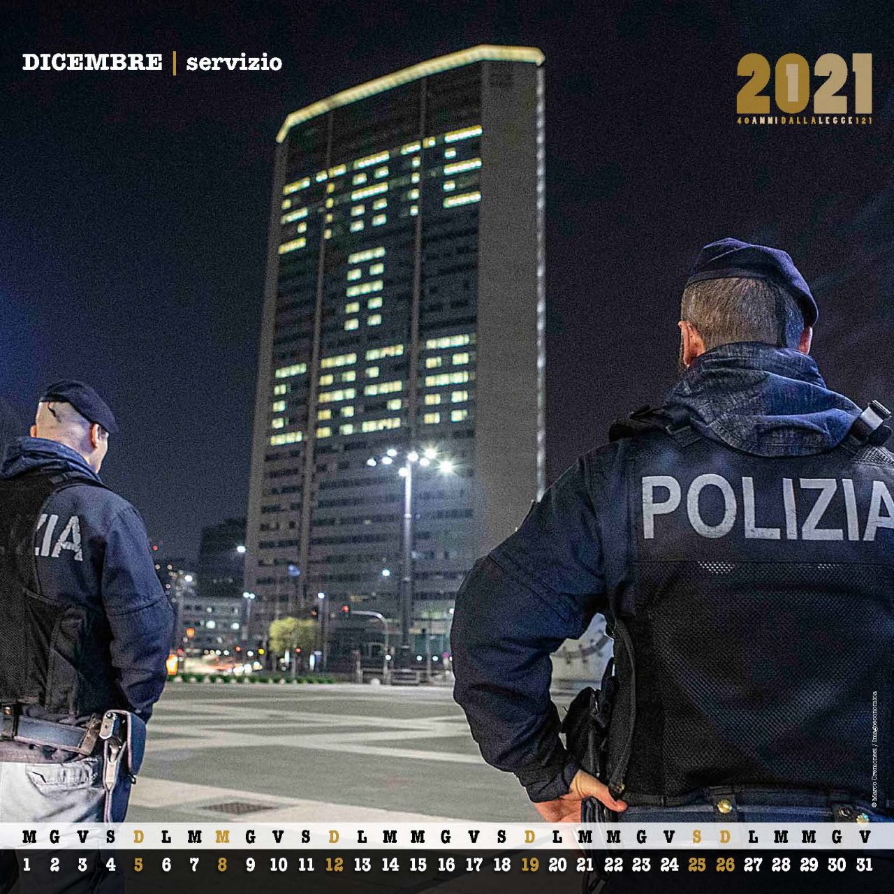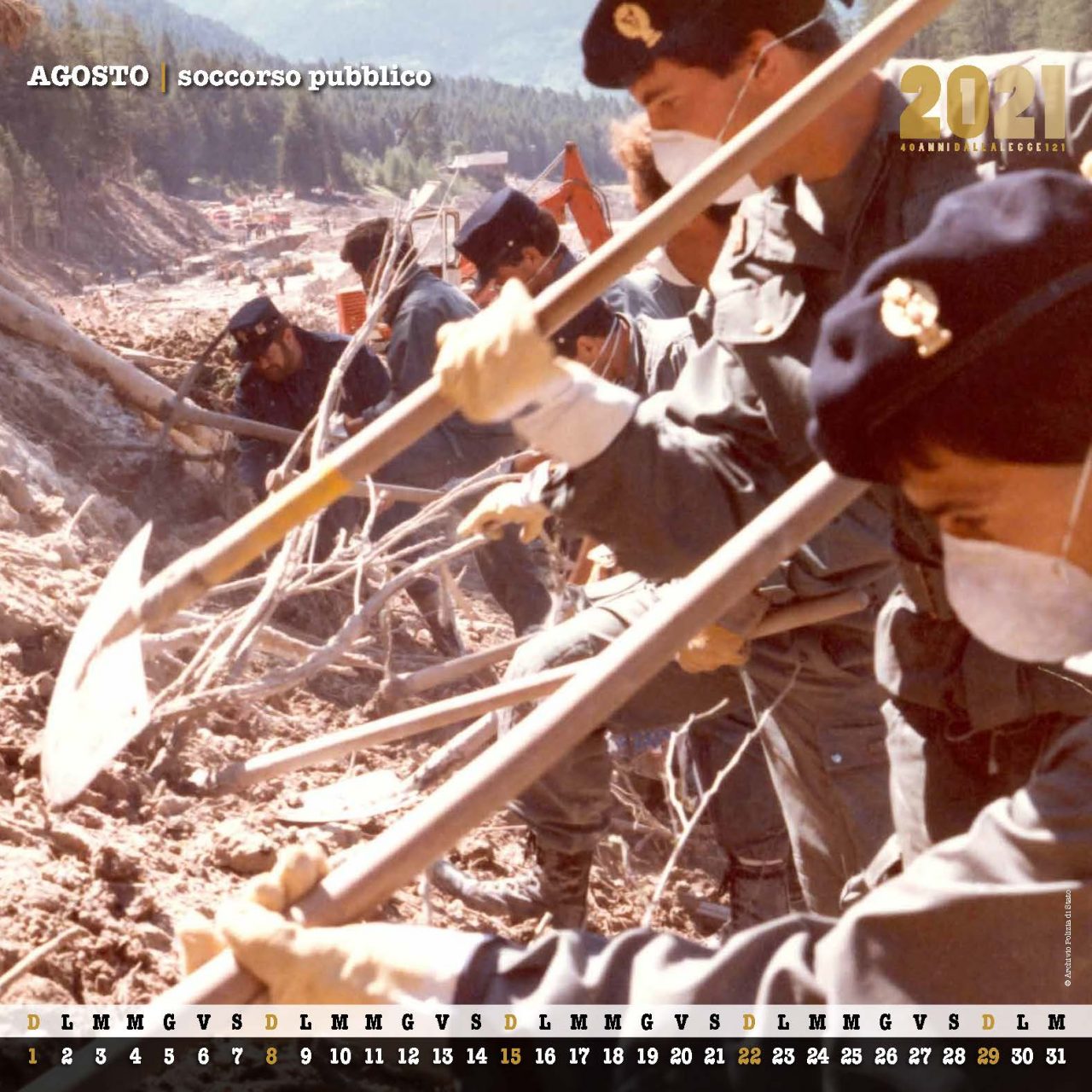 Tre immagini in particolare simboleggiano lo spirito di servizio: il mese di marzo con l’ispettore Santa Perrone e la piccola Elena Luisi salvata dai suoi rapitori, il mese di agosto con il reparto mobile che presta soccorso agli abitanti della Val di Fiemme, il mese di dicembre con i poliziotti impegnati nell’attività connessa all’emergenza Covid 19, a salvaguardia della salute pubblica. Immagini operative e di storia dell’Italia degli ultimi 40 anni che testimoniano la mission delle donne e degli uomini della Polizia di Stato: essere al servizio delle comunità.