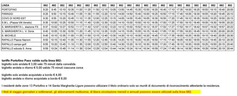 Per viaggiare a bordo delle corriere della linea 882 saranno necessari i biglietti denominati “Portofino Pass” al costo di 3 euro solo andata, e 5 euro andata e ritorno in caso di acquisto in uno dei punti vendita autorizzati (per l’occasione sarà aperta la biglietteria aziendale di piazza Vittorio Veneto a Santa Margherita dalle 9.30 alle 17.15). Il prezzo a bordo autobus sarà di 4 euro solo andata e 6 euro andata e ritorno; fatti salvi ovviamente biglietti e abbonamenti dei residenti. Nel corso della giornata saranno anche effettuate verifiche del personale di polizia amministrativa riguardo i permessi di viaggio dei passeggeri.