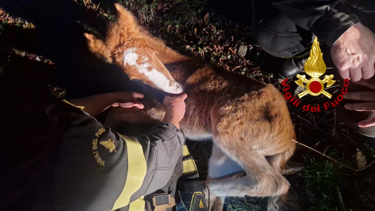 Il cavallino era caduto in una fascia piena di rovi e non riusciva più ad uscirne: la squadra si è calata con le funi, bloccando le zampe dell’animale con delle corde e coprendogli gli occhi per tenerlo calmo, potendo così iniziare le operazioni di recupero.