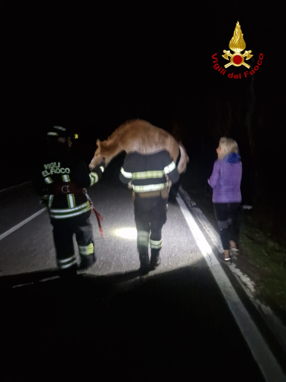 Giunto in salvo, i Vigili del Fuoco hanno cercato la mandria ma ormai si era allontanata.