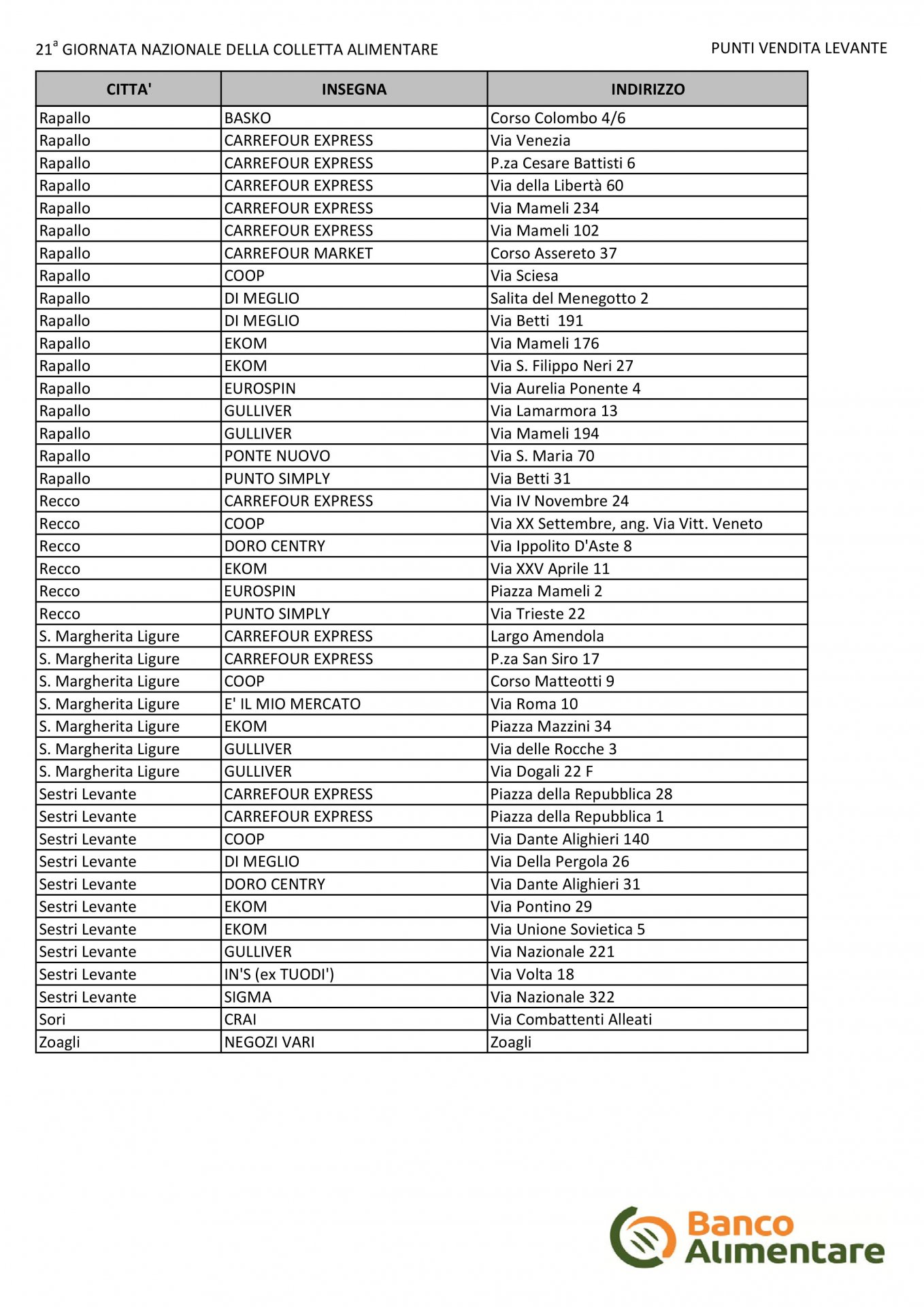 Sabato 24 novembre si terrà in tutta Italia la ventiduesima edizione della Giornata Nazionale della Colletta Alimentare (GNCA), promossa dalla Fondazione Banco Alimentare. Nella nostra regione l’iniziativa coinvolgerà oltre 6mila volontari e 482 supermercati. Gli alimenti raccolti saranno successivamente distribuiti a 394 strutture caritative che aiutano direttamente oltre 50 mila bisognosi. In Liguria la colletta è sostenuta dal distretto 2032 del Rotary. La novità è che per intercettare e coinvolgere il maggior numero di persone sarà possibile aderire alla Colletta Alimentareanche facendo la spesa online sulle piattaforme di alcune grandi catene di distribuzione.