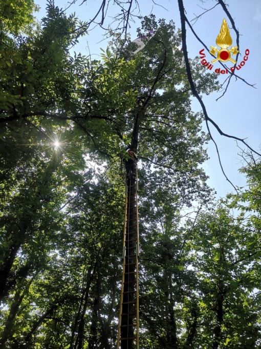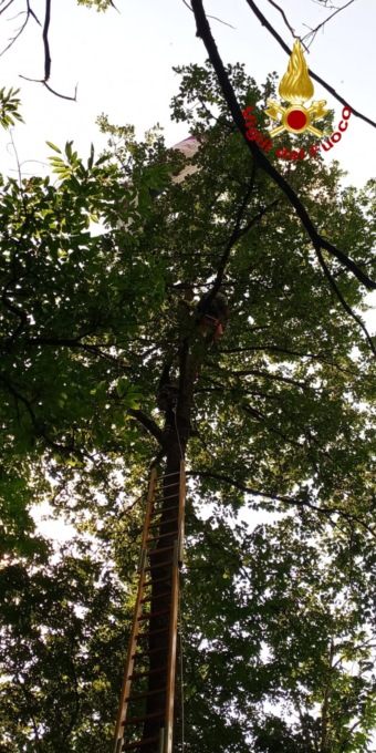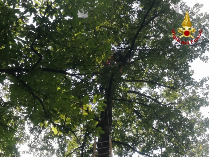 Rimasta illesa, ma bloccata, a circa 20 metri da terra, la persona è stata salvata dai Vigili del fuoco