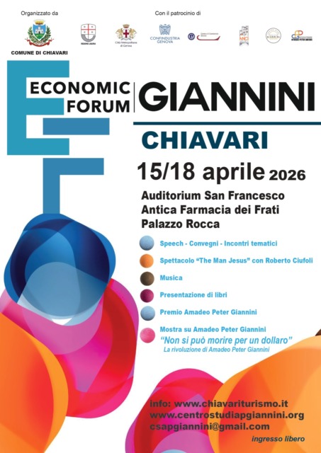 Parte domani la sesta edizione dell’Economic Forum Giannini, in programma dal 15 al 18 aprile tra Palazzo Rocca, Auditorium San Francesco e Antica Farmacia dei Frati. Ad organizzarlo il Comune di Chiavari, in collaborazione con il Centro Studi Amadeo Peter Giannini.