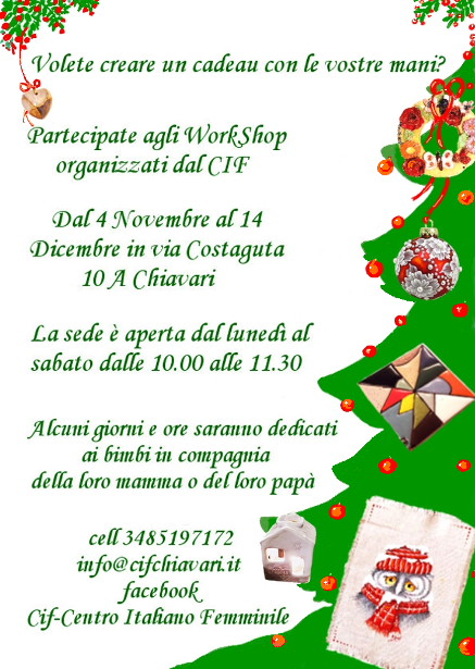 “Si avvicina il Santo Natale e così desideriamo invitare a condividere con noi questo periodo e questa  iniziativa, che è stata  organizzata dalle nostre amiche artiste e artigiane, coloro che si spendono gratuitamente nella mansione di insegnanti dei corsi dal Cif ogni anno organizzati, con la finalità non solo dello  stare insieme, ma con  l’obbiettivo ,attraverso l’insegnamento, il  continuare a mantenere vive quelle tecniche artigianali e artistiche specifiche del nostro comprensorio”.