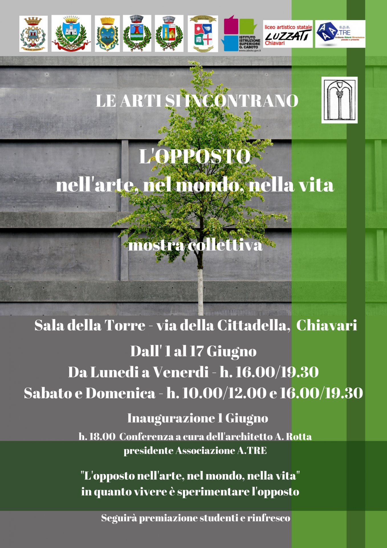 Continuano le iniziative dedicate alla mostra itinerante “L’opposto”. L’iniziativa in arrivo il 1° giugno toccherà Chiavari, Sestri Levante, San Salvatore di Cogorno, Santa Margherita Ligure e Genova in varie sedi. Sarà una mostra a tema dove parteciperanno una trentina di artisti di varia provenienza che utilizzeranno la loro tecnica creativa per interpretare il tema stesso. Si troveranno sculture, quadri ad olio, acquerelli, acrilici, pittura su seta, cuerda seca e così via. Inoltre saranno presentati anche i lavori migliori del Liceo Artistico Luzzati, Istituto Caboto e Istituto Marco Polo.
